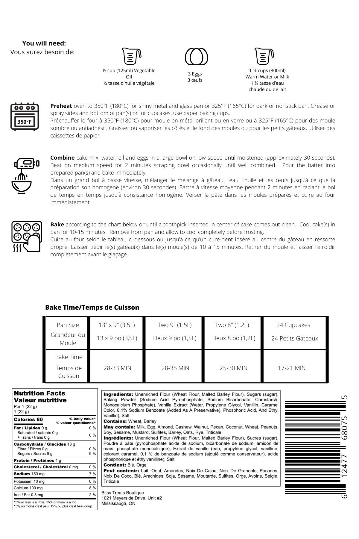 Indulge in the heavenly sweetness of our Vanilla Cake Mix, a delectable treat that promises to tantalize your taste buds with its delicious flavor. Crafted for convenience, this mix is incredibly easy to prepare, making it the perfect choice for busy individuals or aspiring bakers looking to create a mouthwatering dessert effortlessly. Elevate your dessert game with this versatile option that can be customized to suit your preferences, whether you prefer a classic vanilla cake or want to experiment with creative variations. Proudly Canadian-made, this Vanilla Cake Mix embodies quality and taste that you can trust. Experience a slice of culinary delight with every bite. Order now and savor the joy of baking!